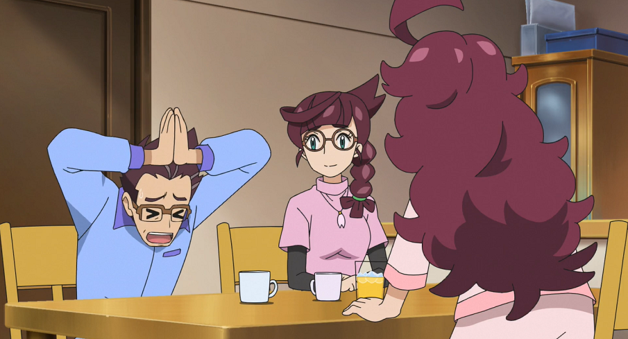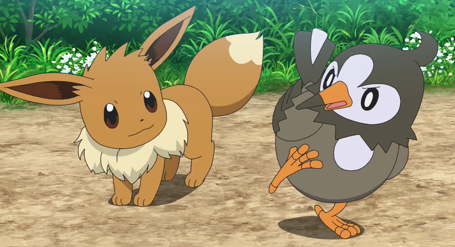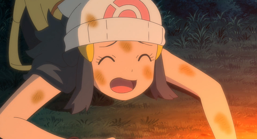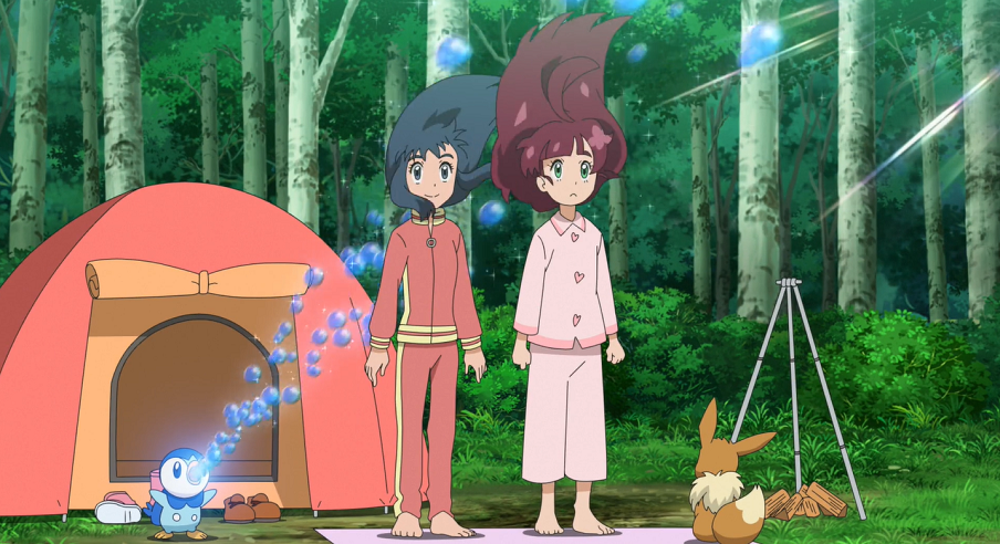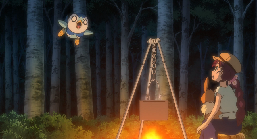Gerade als sie mit dem Essen beginnen wollen und sie sich fragen, ob sie an diesem Platz sicher vor wilden Pokémon seien, stürzt sich ein Plinfa aus dem Gebüsch heraus auf den über dem Feuer hängenden Eintopf, wobei es sich verbrennt. Gleich danach stolpert auch dessen Trainerin Lucia in die Szene.