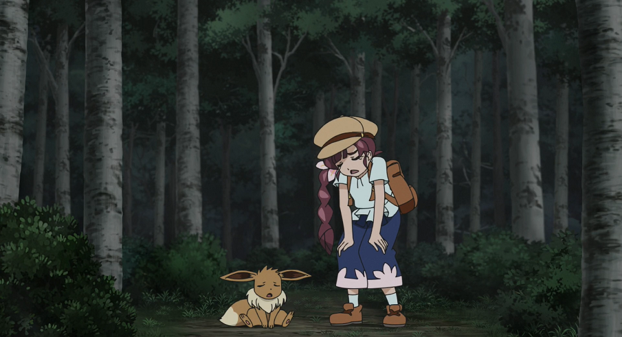 Als die Sonne bereits am Untergehen ist, sind Chloe und Lucia mit ihren beiden Pokémon immer noch im Wald unterwegs und haben auch ihren Streit noch nicht beigelegt. Auf einmal taucht ein müde wirkendes und aggressives Rizeros auf und attackiert sie. Lucia will den Kampf mit Plinfa aufgrund des Typenvorteils in die Hand nehmen. Dieser Plan scheint auch aufzugehen, denn Plinfas Blubbstrahl setzt dem Rizeros ordentlich zu. Dieses weiß sich jedoch mit einer Felswurf-Attacke zu wehren und kann Plinfa so ausknocken. Evoli übernimmt daher für Plinfa und kann mit seinem neu erlernten Blubbstrahl das Rizeros besiegen, das daraufhin sofort einschläft. Chloe und Lucia freuen sich über den positiven Ausgang des Kampfes und die Leistung ihrer beiden Pokémon, wobei ihr Streit vergessen scheint. In der Ferne bemerken Evoli und Plinfa ein merkwürdigen Leuchten an einem Baum.