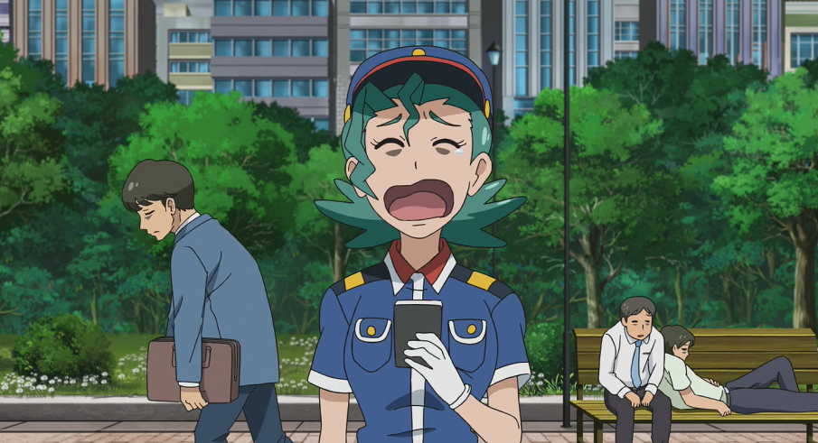 Für ihre Untersuchungen in einer der betroffenen Städte befragen Ash und Goh Officer Rocky, die selbst völlig übermüdet ist. Sie berichtet ihnen von den Schlafproblemen der Bewohner:innen, das eine steigende Zahl von Unfällen und aggressiven Leuten verursache. Zwar habe sie kein Pokémon gesehen, allerdings habe sie festgestellt, dass dieses Problem jeweils wochenweise von einer Stadt zur nächsten Stadt weitergewandert sei. Diese Tatsache erhärtet für Ash und Goh ihren Verdacht, dass es sich bei der Ursache des Problems um ein Pokémon handele, dessen Fährte sie durch weitere Befragungen aufnehmen wollen.
