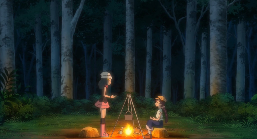 Als der Regen nachgelassen hat, bemerken Chloe und Evoli einen sehr schönen See, an dem sie beschließen zu campieren. Es dauert etwas, bis sie für sich und Evoli ein Feuer entfacht und einen Eintopf gekocht hat.
