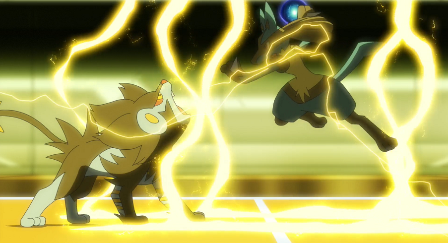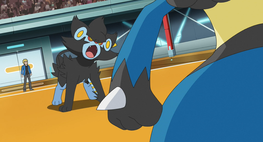 Der Arenaleiter schickt wieder Luxtra in den Kampf, das erneut Elektrofeld einsetzt. Beide Pokémon verlieren keine Zeit: Lucario setzt Aurasphäre ein, Luxtra Hochspannung. Als beide Pokémon in der Mitte des Feldes aufeinandertreffen, entsteht so eine heftige Explosion, an deren Anschluss zwar beide Pokémon erst einmal noch auf den Beinen stehen, doch dann gleichzeitig kampfunfähig zu Boden gehen.