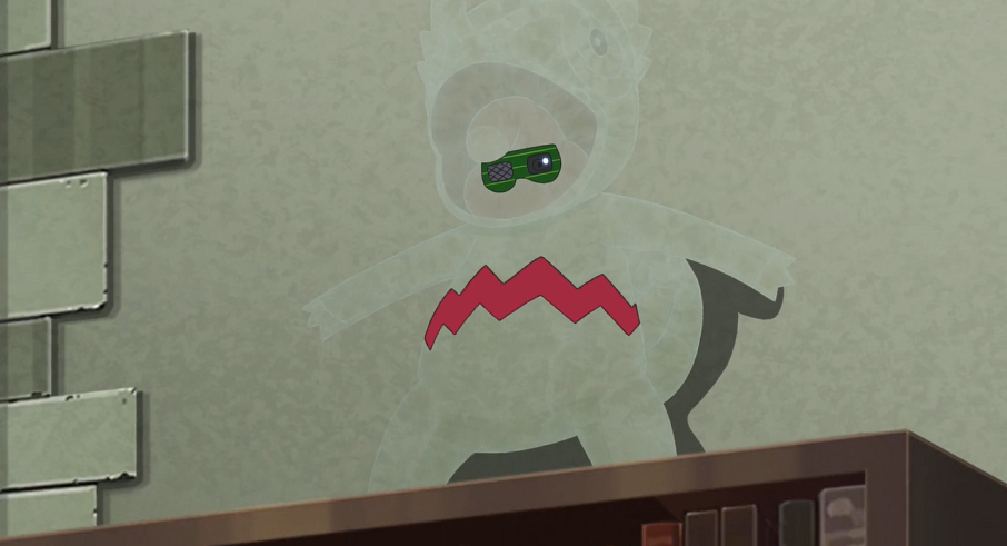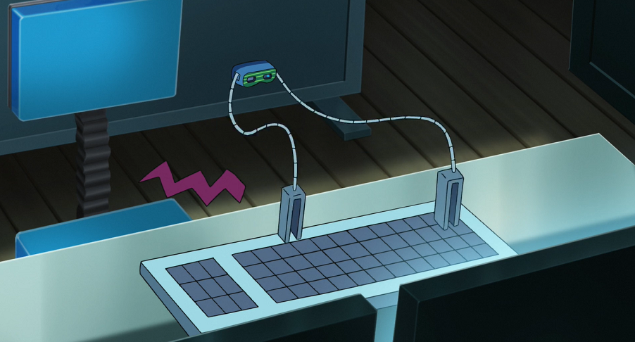 Professor Kirsch, Christin und René haben ihre Daten mit neuen Passwörtern gesichert. Jedoch bemerken sie nicht, wie das weiterhin unsichtbare Kecleon hinter ihnen an der Wand mit einer Kamera in einem Gerät, das es mit seiner Zunge festhält, alles aufgezeichnet hat.
