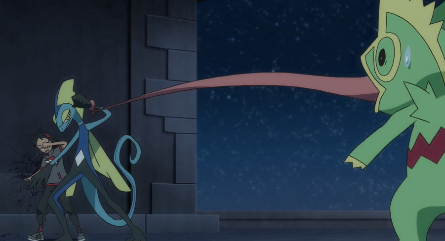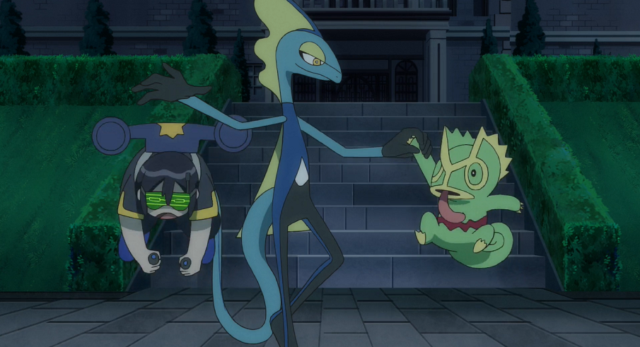 Ash und Pikachu sowie Professor Kirsch werden ebenfalls durch den Lärm geweckt. Ash trifft Goh, wie dieser gerade dabei ist, Kecleon auf das Dach zu folgen. Dort versucht Phlegleon den Anschluss zu halten.