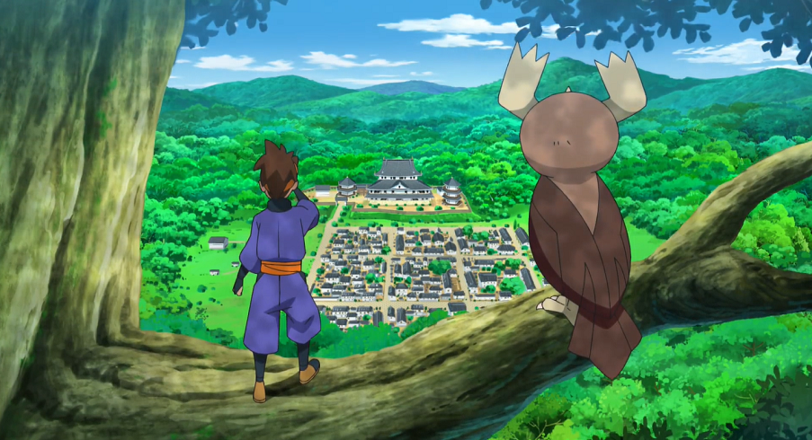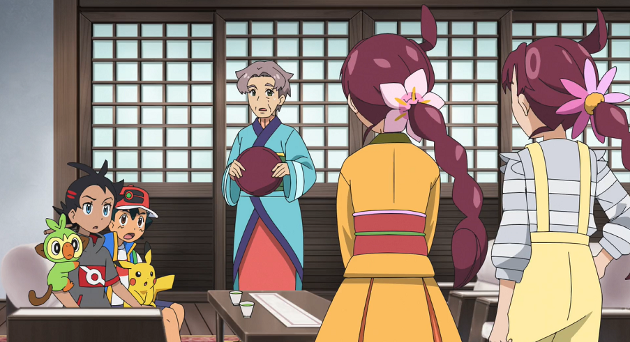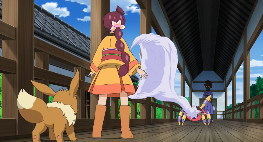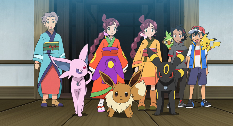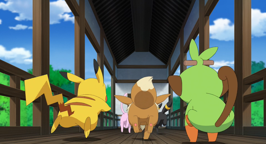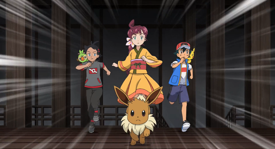 Ash und Goh suchen gemeinsam bei der Sonnenuhr auf dem Hügel mit Pikachu, Chimpep und Evoli nach Chloe. Plötzlich bekommt Evoli eine Eingebung und sie sieht den Baum, in dem Chloe versteckt gehalten wird, vor ihrem inneren Auge. Sofort eilt sie, gefolgt von Ash, Goh und den beiden anderen Pokémon, los.
