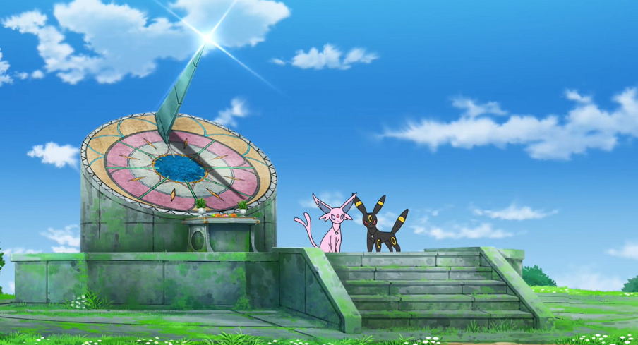 Als sie dort ankommen, finden sie sich vor einem eindrucksvollen Gebäude wieder. Im Wappen des Schlosses, das überall zu sehen ist, sind Psiana und Nachtara abgebildet. Während Ash und Goh über das Schloss staunen, entdeckt Evoli auf einem etwas weiter entfernten Hügel ein Licht. Auf diesem befindet sich eine Sonnenuhr, vor der ein Psiana sowie ein Nachtara stehen, die jeweils ein Amulett um den Hals tragen. Evoli eilt, gefolgt von Chloe und ohne dass es Ash und Goh bemerken, dorthin.