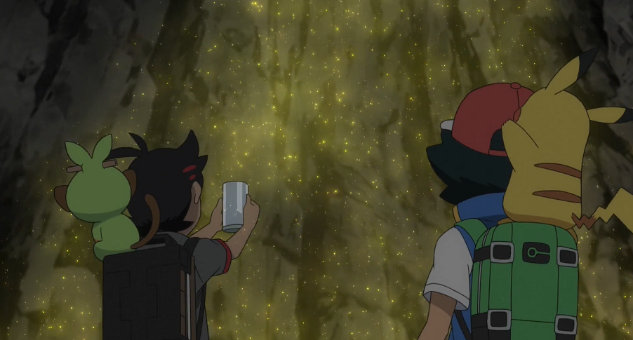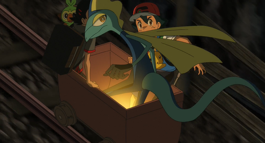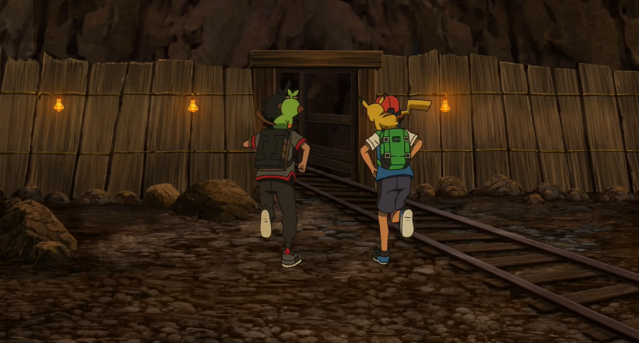 Ash und Goh machen sich auf zu der verlassenen Stadt. Auf den ersten Blick scheint es dort allerdings nichts von Interesse zu geben. Neben dem großen Vulkan im Hintergrund fällt ihnen nur der Eingang zu einer Goldgräbermine auf. Gemeinsam beschließen sie, sich in dieser umzusehen. Die beiden schnappen sich eine Laterne und machen sich, den Schienen folgend, auf den Weg in das Innere. Dort treffen sie schnell auf ein angriffslustiges Kiesling, das sich ihnen in den Weg stellt. Goh setzt Intelleon ein, welches das Kiesling mit seinem Präzisionsschuss ausknockt, sodass er es ohne Probleme fangen kann. Allerdings müssen sie feststellen, dass bereits eine Horde Kiesling nachrückt und sie attackiert. Reaktionsschnell flüchten sich Ash, Goh und ihre Pokémon in eine Lore und können so für Erste entkommen. Allerdings rasen sie anschließend mit hoher Geschwindigkeit auf das Ende der Schienen zu, das direkt in einen Abgrund führen würde. Sie bemerken jedoch eine Weiche zuvor, die Intelleon auf Gohs Anweisung hin mit seinem Präzisionsschuss gerade noch rechtzeitig umstellen kann.