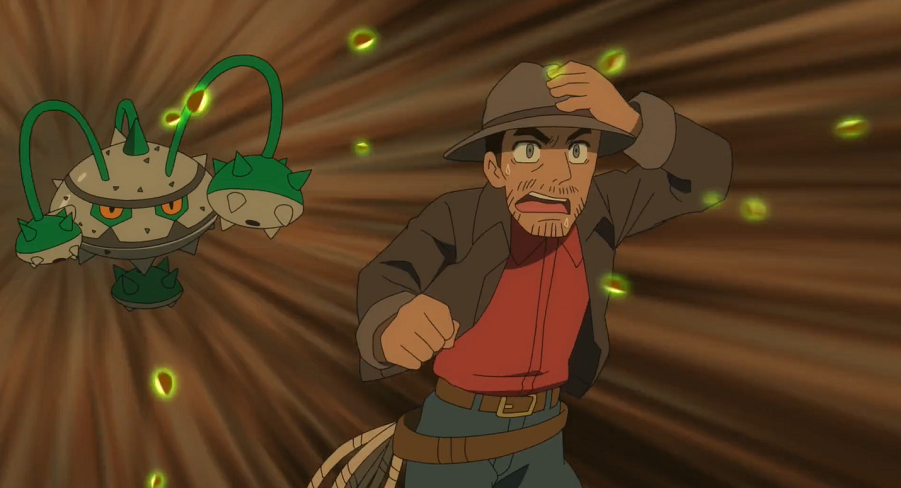 Der Mann führt sie zu einem Minen-Bahnhof, von dem man aus die nächste Mine erreichen könne. Goh wundert sich, dass der Mann sich so gut auskenne. Ash bemerkt unter der Treppe des hölzernen Bahnhof-Gestells einige weiß-rote Pokémon-Eier. Der Mann schaut sich die Eier genauer an und stellt fest, dass es sich um Ignivor-Eier handle. Ash und Goh vermuten, dass Ramoth ebenfalls in der Nähe sein müsse, um die Eier zu beschützen. Um zu verhindern, dass Ramoth dies gelingen kann, möchte der Mann deshalb die Eier schnell mitnehmen. Dazu setzt er schnell sein Voltula ein, das Ash und Goh mit Klebenetz fixiert. Der Mann gibt sich als Pokémon-Jäger zu erkennen und erklärt, dass er die Pokémon in dieser Umgebung gefangen habe, weshalb Ramoth offenbar verschwunden sei. Wenn er die Eier mitnehme und verkaufe, könne er so immerhin noch etwas Geld verdienen.