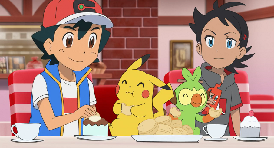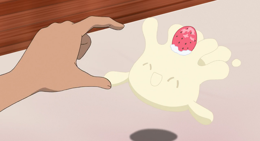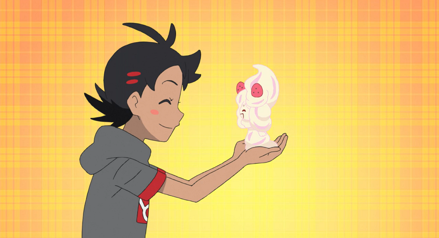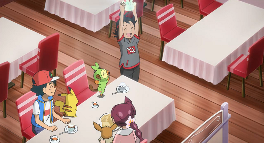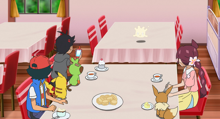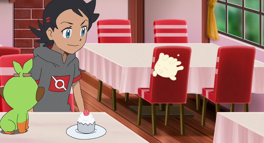 Am Nebentisch bemerken sie beim Essen auf einmal ein Hokumil, das sich Goh nähert und freudig von diesem fangen lässt. Goh lässt es anschließend gleich wieder aus seinem Ball, woraufhin es mit Evoli und Chimpep anfängt zu spielen. Als Chloe und Goh den Trubel unterbrechen, beginnt Hokumil sich für die Erdbeere auf Gohs Kuchen zu interessieren. Goh setzt Hokumil diese daraufhin auf und sie beginnt glücklich in der Luft zu tanzen. Goh lässt sich davon anstecken, nimmt Hokumil in seine Hände und beginnt sich mit ihr ausgelassen zu drehen. Nach einigen Drehungen hebt er Hokumil nach oben und das Sahne-Pokémon beginnt zum Erstaunen aller sich auf einmal zu Pokusan weiterzuentwickeln. Der Konditor kommt an ihren Tisch und erklärt ihnen, dass sich Hokumil tatsächlich durch Drehen entwickle. Vermutlich war Hokumil durch die dekorative Erdbeere sehr glücklich.
