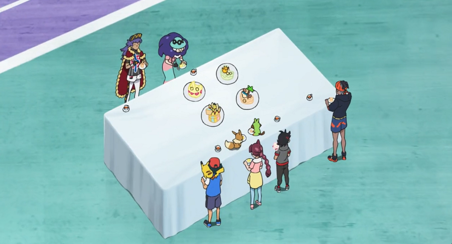 Delion stößt nun hinzu. Ash freut sich sehr, ihn zu sehen und erklärt ihm, dass er es kaum erwarten könne, gegen ihn zu kämpfen. Dieser erwidert jedoch, dass das ganz von Papella abhänge. Er erkundigt sich bei dieser, welche Art von Turnier sie diesmal geplant habe. Unter den gespannten Blicken aller ruft sie das erste Pokusan-Deko-Turnier aus. Hinter ihr betreten nun viele Pokusan in den verschiedensten Geschmacksformen das Feld und sie erklärt, dass es Aufgabe bei diesem Turniers sei, mit einem Pokusan gemeinsam eine Torte zu dekorieren. Delion berichtet, Papella veranstalte immer mal wieder spontane Turniere, wobei diese manchmal Kämpfe beinhalten würden - diesmal jedoch nicht. Ash ist kurz enttäuscht, doch schnell lässt er sich, wie auch alle anderen, auf das Turnier ein und entscheidet sich auch für eines der Pokusan. Goh will mit seinem eigenen Pokusan antreten. Nachdem alle bereit sind, gibt Papella den Startschuss und das Turnier kann beginnen.