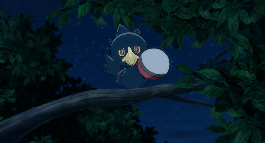 Die beiden kommen in der Stadt an, in der tiefe Nacht ist, obwohl zeitlich eigentlich Morgen wäre. Ash und Goh können beobachten, wie die Menschen dennoch versuchen, ihren normalen Tagesablauf zu leben. Dabei treffen sie auf einen älteren Mann, der gerade versucht, seinen Frühsport zu machen, jedoch, genauso wie sein Mogelbaum, ziemlich müde ist. Er berichtet ihnen, dass dieser Zustand nun bereits seit einer Woche anhalte. Neben den Auswirkungen auf den Biorhythmus mache die permanente Nacht auch den Blumen zu schaffen, die ohne das Sonnenlicht verwelken. Auch die Kramurx in der Stadt seien nicht sehr froh, da sie mit Unglück verbunden würden, wenn Menschen ihnen in der Dunkelheit begegnen. Als Goh eines davon auf einem Baum über ihnen sieht, bietet er ihm an, mit ihm zu kommen. Bereitwillig lässt sich das Unlicht-Pokémon mit einem geübten Wurf fangen. Der Mann beschließt, nach Hause zu gehen. Chimpep dagegen kann einigen der welken Blumen mit seinem Schlägel wieder Kraft verleihen. Ash und Goh können am Nachthimmel eine Sternschnuppe entdecken und genießen trotz der Umstände den schönen Sternenhimmel.