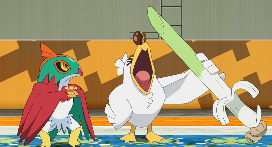 Das Kampf-Flug-Pokémon bremst das heranstürmende Lucario sogleich mit Turmkick und beginnt es mit Flügelschlag zu bearbeiten. Da auch Lucario sich mit Hieben und Tritten wehrt, kommt es zu einem rasanten Schlagabtausch, bei dem sich beide Pokémon neutralisieren. Saida weist Resladero an, Himmelsfeger einzusetzen. Lucario versucht das gegnerische Pokémon noch mit Kraftwelle aufzuhalten, doch Resladero ist bereits in der Luft, um sich spektakulär auf Lucario zu stürzen. Ashs Pokémon braucht etwas, um nach diesem Treffer wieder aufzustehen, ist dann aber entschlossen, weiterzukämpfen. Saida ruft Reladero zurück und schickt mit Machomei bereits ihr drittes Pokémon aufs Feld.