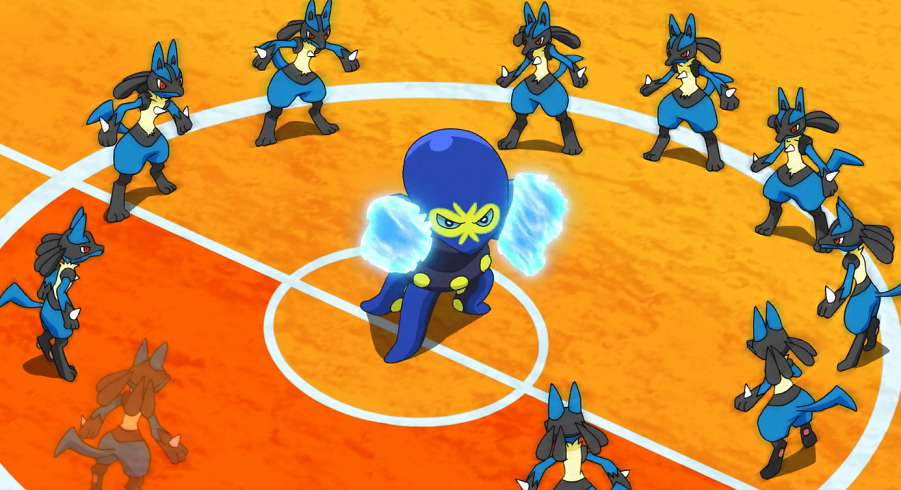Kaocto setzt Aquadurchstoß ein. Lucario begegnet der Attacke mit Doppelteam, wodurch es Saidas Pokémon nicht gelingt, das echte Lucario zu treffen. Dieses will seinen Vorteil nutzen und mit Aurasphäre angreifen. Allerdings kann Kaocto erneut durch Scanner ausweichen und wird danach von Saida zurückgerufen und durch Resladero ersetzt.