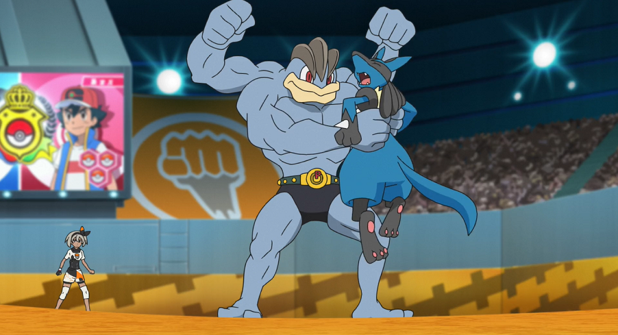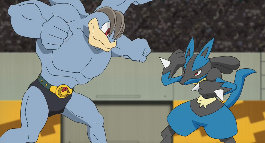 Machomei zögert ebenfalls nicht lange und legt sofort mit Patronenhieb los. Lucario kann mit Kraftwelle nicht viel gegen Machomei ausrichten und hat mit dessen vier Armen große Probleme. Schließlich schnappt sich Machomei Lucario mit zwei seiner Hände, um mit den anderen beiden einen Kreuzhieb zu landen. Danach lässt es weitere Patronenhiebe folgen und hält Lucario weiterhin fest. Ash ist verzweifelt und möchte Lucario helfen, indem er die Mega-Entwicklung einsetzt. Dazu aktiviert er seinen Schlüsselstein. Doch Lucario wehrt sich dagegen, wodurch Ashs Schlüssel-Stein wieder aufhört zu leuchten. Mit einem geschickten Kopfstoß kann sich Lucario aus Machomeis Fängen befreien. Ash versteht Lucario und erklärt ihm gegenüber, zu voreilig gehandelt zu haben.