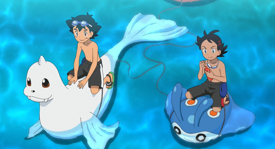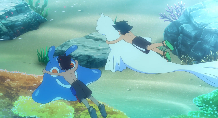 Am Strand von Graphitport City beginnen sie mit ihrem Abenteuer. Ash auf Jugong und Goh auf Mantirps begeben sich, mit Pikachu und Chimpep in einem Schlauchboot im Schlepptau, aufs Meer. Von dort setzen sie auf ihren Pokémon zum Tauchgang an. Unterwasser sehen und treffen gleich auf einige Corasonn und Liebiskus. Gohs Versuch, ein Liebiskus zu fangen, scheitert jedoch, da er unter Wasser den Pokéball nicht ordentlich werfen kann und dieser nach zur Oberfläche treibt. Kurz danach stoßen sie auf ein wildes Barschwa, das sie so sehr erschreckt, dass sie Wasser einatmen. Schnell eilen sie an die Oberfläche, wo sie wiederum Pikachu und Chimpep, die sich im Schlauchboot ausruhen, einen Schrecken einjagen.