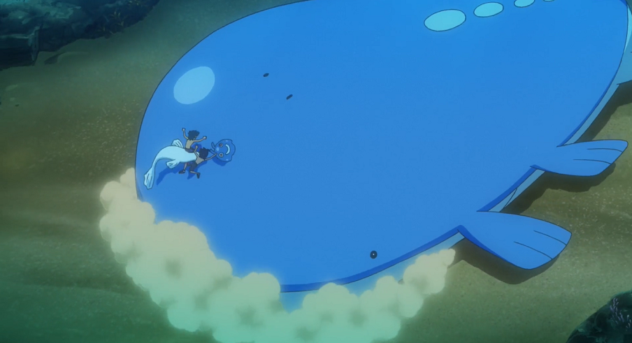 Da sie bisher nicht mal die Spur eines Seedraking oder gar Seemon gefunden haben, beschließen sie, in einem erneuten Anlauf nun etwas tiefer zu tauchen. Wieder treffen sie auf Wasser-Pokémon wie Krebscorps, Krebutack, Austos und Perlu. Auf dem Meeresboden vernimmt Goh ein Funkeln, das sich bei genauerem Betrachten als eine Scherbe herausstellt. Als beide darüber rätseln, wozu diese gehören könnte, taucht hinter ihnen ein Wailord auf, das sie mit einer Fontäne zurück an die Wasseroberfläche schießt.