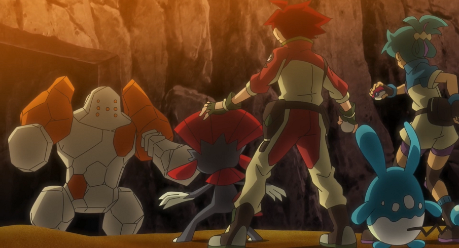 Etwas später telefoniert Goh mit Danika vom Projekt Mew, die den Fang des Seedraking inzwischen verifiziert hat und ihm den erfolgreichen Abschluss der Mission bescheinigt. Diese ist zur selben Zeit mit ihrem Azumarill sowie Quentin und dessen Snibunna auf dem Weg zu einer Ruine, aus der ihnen ein Regirock entgegentritt, das sie herausfordern.