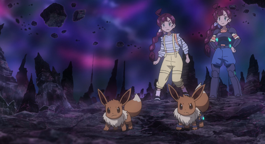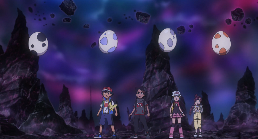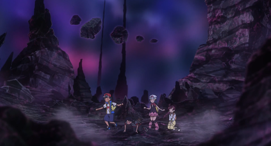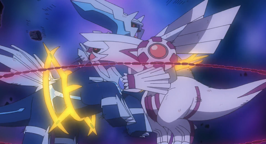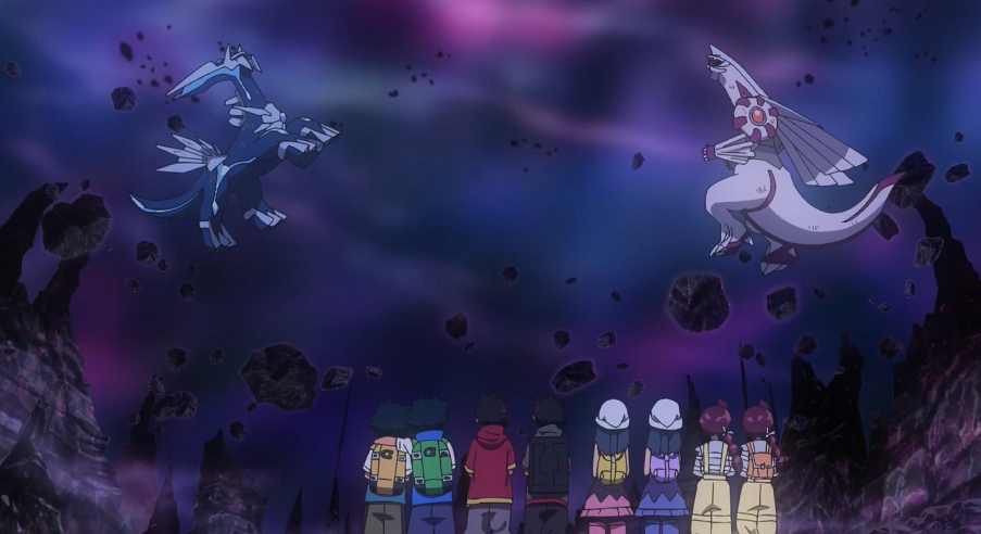 Die echten Ash, Goh, Chloe und Lucia landen tatsächlich an dem Ort, an dem sich Dialga und Palkia befinden. Allerdings scheinen diese eng beieinander gefangen zu sein. Beide kämpfen miteinander, wobei immer wieder Energie von Palkia freigesetzt wird, die Tore öffnet. Aus diesen entweicht dann wiederum von Dialga freigesetzte Energie und scheint auf der anderen Seite der Tore für die Verzerrungen in der Zeit zu sorgen.