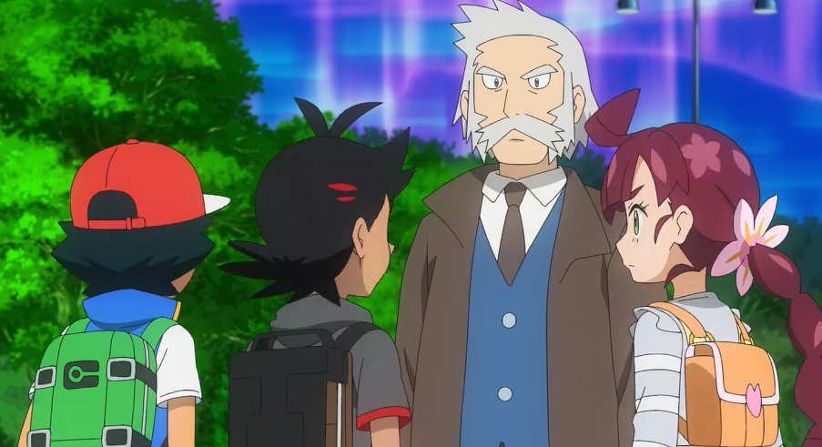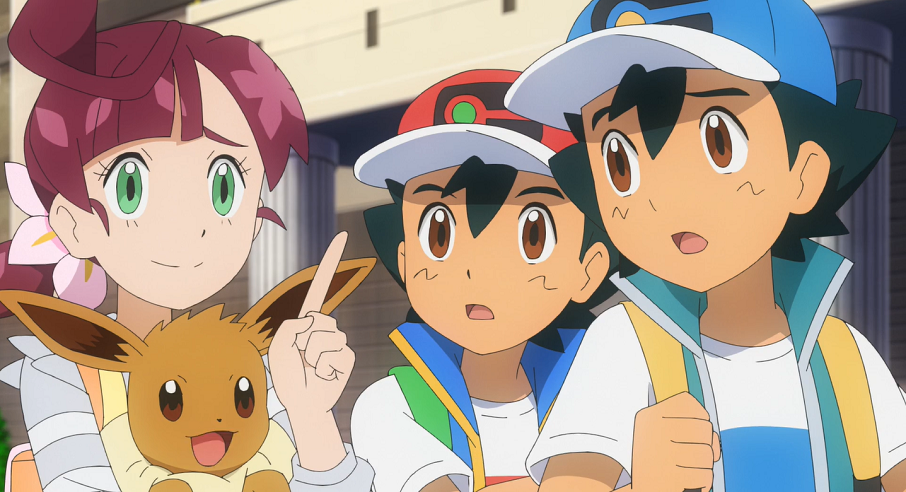Vor dem Pokémon-Center gelandet sehen sie gleich, wie Professor Eibe das Pokémon Center eilig verlässt und zu einem LKW geht, in den eine Frau etwas verlädt. Goh kommt gemeinsam mit Lucia und der anderen Lucia aus dem Pokémon-Center gerannt, um Professor Eibe noch zu erreichen. Dabei erblickt er Ash und Chloe. Gemeinsam können sie beobachten, wie ein zweiter Professor Eibe in einem Auto herbeigefahren kommt, aus diesem aussteigt und den anderen Professor Eibe zur Rede stellt, der gerade mit der Frau verschwinden will. Der falsche Professor Eibe und die Frau lassen ihre Maske fallen und geben sich als James und Jessie aus dieser Welt zu erkennen. Goh erläutert, dass die beiden demnach versucht hätten, die Pokémon aus dem Pokémon-Center zu stehlen. Ash und Goh schicken Pikachu und Liberlo in den Kampf, während ihnen Mauzi entgegentritt. Jessie, James und Woigenau machen sich mit dem Gefährt aus dem Staub. Als Pikachu und Liberlo angreifen wollen, beginnen sie jedoch auf einmal und zum Erstaunen ihrer Trainer sich zu Pichu und Kickerlo zurückzuentwickeln. Mauzi kann sich so ebenfalls aus dem Staub machen. Der andere Ash rät allen, ihre Pokémon in ihre Pokébälle zurückzuziehen, um so zu versuchen, sie vor dem Effekt zu schützen. Chloe, Goh und Lucia folgen diesem Rat, während Ash Pichu nur in seiner Westentasche verstauen kann. Goh befürchtet, dass ihre Pokémon bald ebenfalls zu Eiern werden. Professor Eibe stimmt mit ein und erläutert, dass dies nicht nur Pokémon und Pflanzen betreffe, sondern auch die Menschen. Chloe und Goh vermuten, dass neben Palkia, dem Herrscher des Raumes, auch Dialga aufgrund des Durcheinanders in der Zeit beteiligt sein könnte. Professor Eibe erläutert ihnen, dass sie diese wohl bei der Speersäule auf dem Kraterberg antreffen könnten. Ash und Goh erhoffen sich, dass beide die Verzerrungen wieder beheben und die bestehenden Probleme rückgängig machen können. Professor Eibe hält es für möglich, dass ihnen diese Mission gelingen kann.