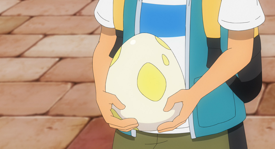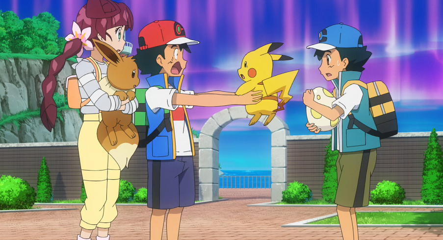 Als sich Ash und Chloe in der anderen Welt auf die Suche nach Goh und Lucia machen wollen, laufen sie Ashs alternativer Version aus dieser Welt über den Weg. Dieser ist von dem Aufeinandertreffen wiederum genauso verwirrt wie der echte Ash und will daher die Flucht ergreifen. Doch Ash hält ihn zurück und Chloe beginnt, ihm von der anderen Welt, aus der sie kommen, zu erzählen. Als der andere Ash Pikachu sieht, bricht er in Tränen aus. Den Grund zeigt er Ash und Chloe unmittelbar: in seiner Tasche befindet sich ein Ei, zu dem sich sein Pikachu zurückverwandelt hat. Er berichtet, dass die Zeit sich zurückzudrehen scheine. Das erinnert Ash daran, wie sich sein Pikachu im Kampf gegen das andere Team Rocket in der richtigen Welt zuvor ebenfalls nicht mehr an seine Donnerblitz-Attacke hat erinnern können. Der andere Ash führt aus, dass es seinem Pikachu zuerst genauso ergangen sei, ehe es sich dann zu Pichu zurückentwickelt und anschließend wieder in ein Ei verwandelt hat. Ash ereilt daraufhin die Furcht, dass das auch mit seinem Pikachu geschehen könnte. Der andere Ash lädt die beiden ein, mit ihm nach Sandgemme ins Pokémon-Center zu gehen, wo sich der Professor Eibe dieser Welt mit dem Phänomen auseinandersetze. Auf Ashs Dragoran und Gengar machen sie sich auf den Weg dorthin.