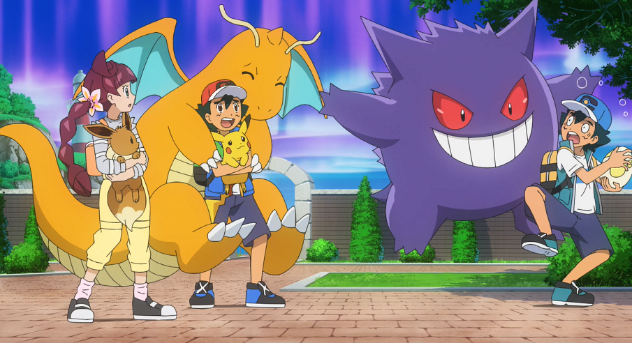 Um zur Speersäule zu kommen, ruft Ash erneut Dragoran und Gengar aus ihren Pokébällen. Sofort entwickeln sich diese jedoch zu Dragonir und Alpollo zurück. Ash zieht die beiden schnell zurück in ihre Pokébälle und Goh setzt stattdessen Aerodactyl und Libelldra ein. Da beide nicht genug Platz bieten, wollen die andere Lucia und der andere Ash nachkommen, während Ash, Goh, Chloe und Lucia sich direkt auf Gohs Pokémon zur Speersäule aufmachen.