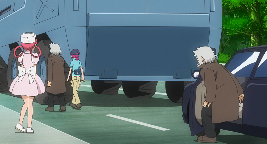Zeitgleich suchen der andere Ash und die andere Lucia per Smart-Rotom nach einer Gelegenheit, um zum Kraterberg zu kommen. Auf einmal kommen die alternativen Versionen von Chloe und Goh aus dieser Welt auf Aerodactyl und Libelldra angeflogen und wollen sie zum Kraterberg bringen. Sie tragen, wie ihre Pokémon, dieselben Schutzanzüge wie das andere Team Rocket und erklären ihnen während des Flugs, dass sie herausgefunden hätten, dass diese Anzüge sie und ihre Pokémon vor den Einflüssen der Zeiteffekte schützen.