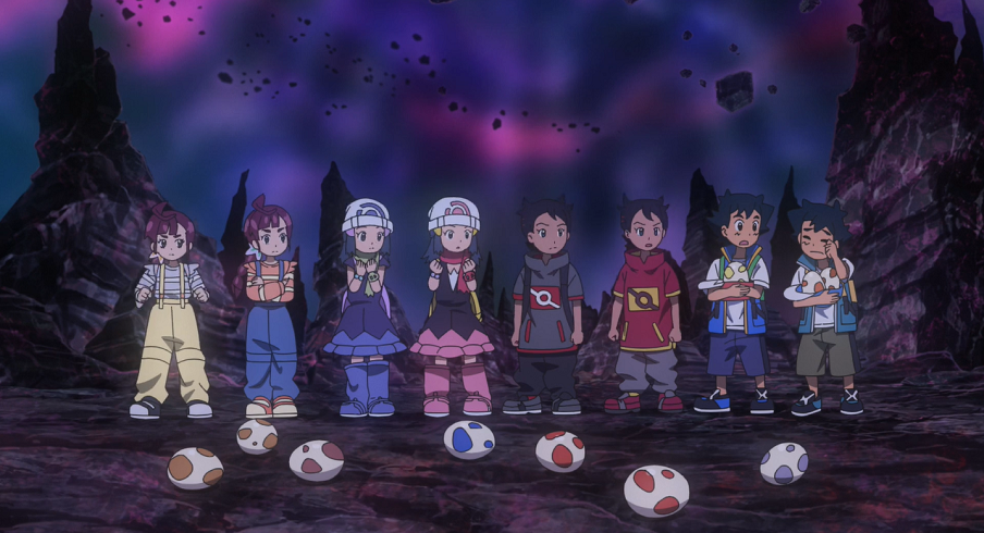 Ash, Goh, Chloe und Lucia sind auf dem Kraterberg bei der Speersäule angekommen. Als Ash nach den beiden ruft, bemerkt Pichu neben ihnen ein Tor, das in eine andere Welt zu führen scheint, wo sie Dialga und Palkia vermuten. Sie beschließen, durch das Tor zu gehen.