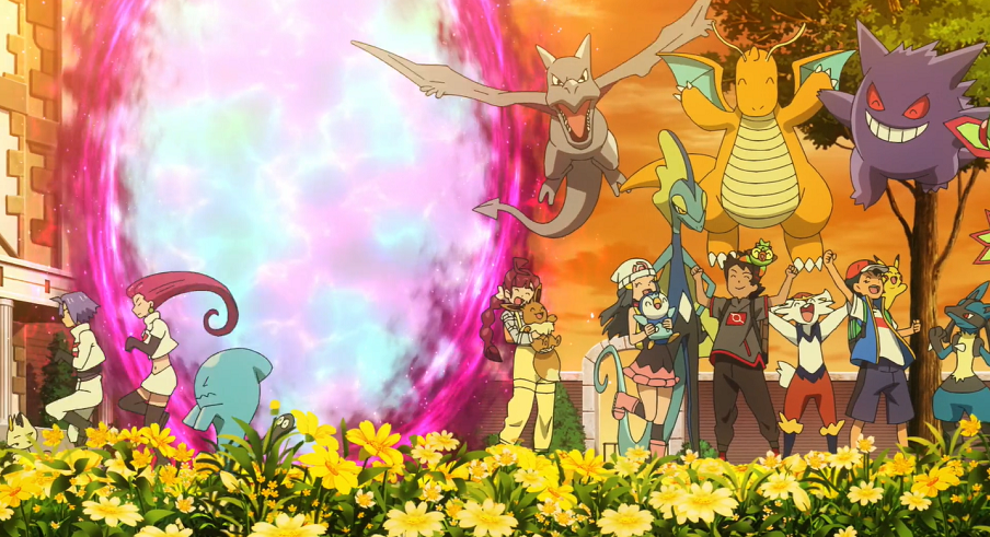 In der echten Welt wieder angekommen, sind die erleichtert, dort wieder Pokémon und Blumen in der Umgebung sehen zu können. Cynthia ist ebenfalls sehr froh, dass alle wohlbehalten zurück sind.