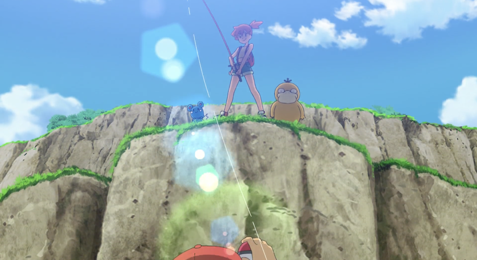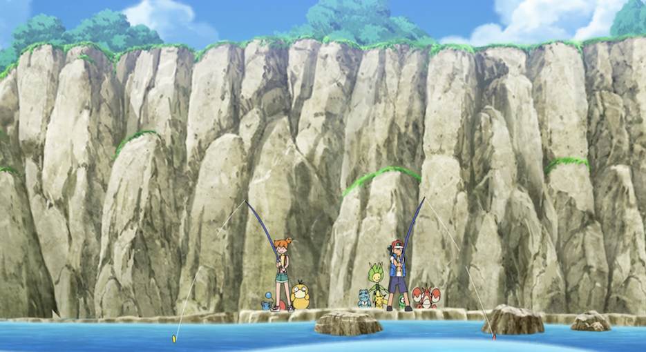 Misty schlägt vor, die Angelegenheit durch ein Angel-Duell zu entscheiden. Dazu zückt sie ihre Angel, an der ein Misty-Köder hängt. Als sie bemerkt, dass an Ashs Angel mit einem Köder von Benny ein anderer als ihr Köder hängt, den sie ihm gegeben habe, ist sie kurz enttäuscht. Ash erklärt neckisch, dass er mit dem Köder, den er von einem Freund habe, mehr fange. Beide sind motiviert, das Angel-Duell für sich zu entscheiden und eilen zum Wasser.