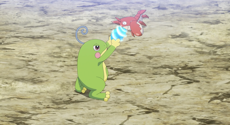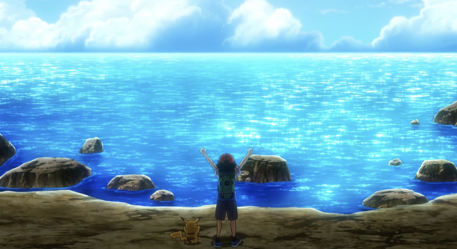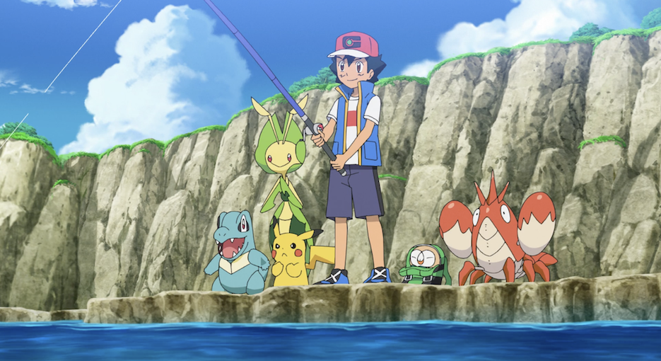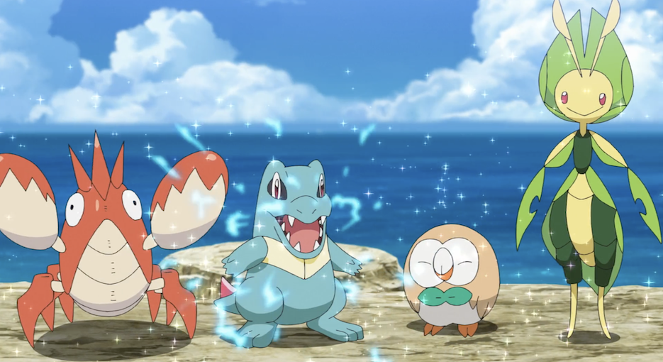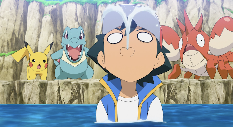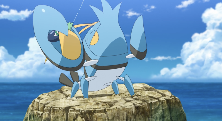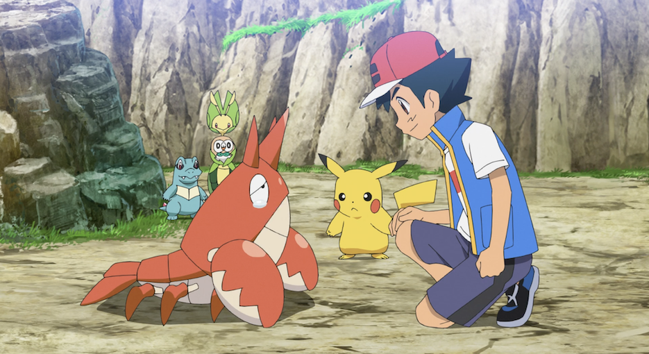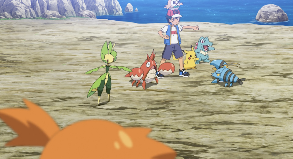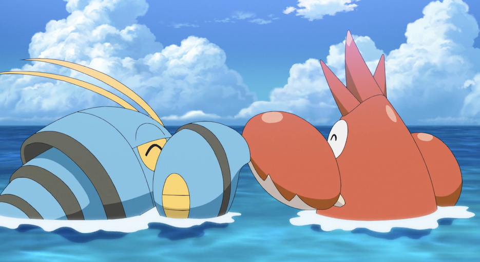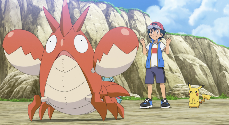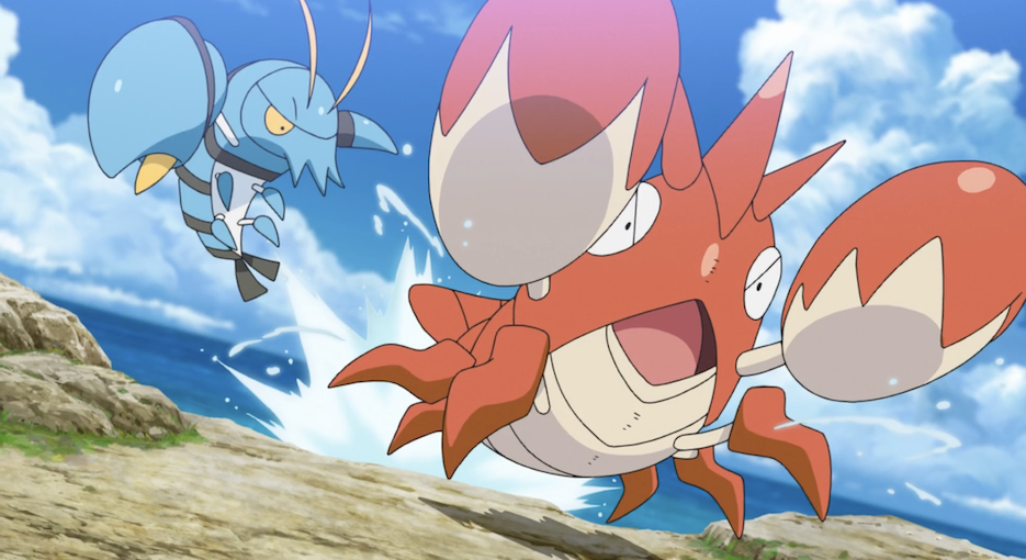 Ash und Pikachu sind an der Küste, wo die beiden den Anblick des Meeres gemeinsam mit Ashs Pokémon Karnimani, Krebscorps, Matrifol, Bauz, die er diesmal in seinem Team dabei hat, genießen. Besonders Krebscorps scheint begeistert und stürmt sofort ins Wasser, wobei sogar die anderen Pokémon ins Wasser stürzen. Freudig schwimmt es dann umher.