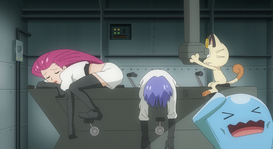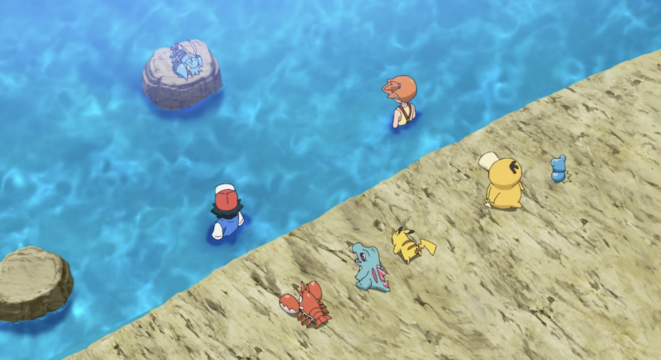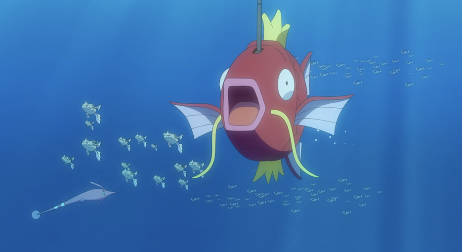 Die beiden bemerken nicht, wie Team Rocket die beiden aus ihrem Karpador-U-Boot beobachtet. Allerdings sind die drei zu hungrig, um wirklich motiviert anzugreifen.