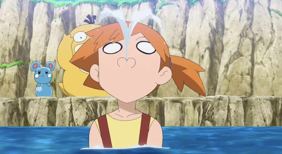 Misty gelingt es nicht, das Scampisto an Land zu ziehen, da sich dieses entschlossen wehrt. Letztlich zieht das Wasser-Pokémon Misty selbst ins Wasser, was für großes Gelächter bei Ash sorgt.