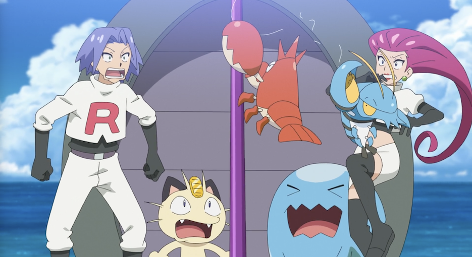 Zuvor angelt sich jedoch Team Rocket mit einem goldenen Mauzi-Köder das Scampisto und taucht mit dem Karpador-U-Boot aus dem Wasser auf. Kraftlos vor Hunger verkünden sie leise ihre Kampfansage und erklären, was sie mit Scampistos Schere vorhaben. Allerdings müssen sie dann kraftlos mit ansehen, wie Krebscorps das Scampisto befreit und die Wasser-Pokémon Team Rocket gemeinsam mit ihren Krabbhammer-Attacken in die Flucht schlagen.
