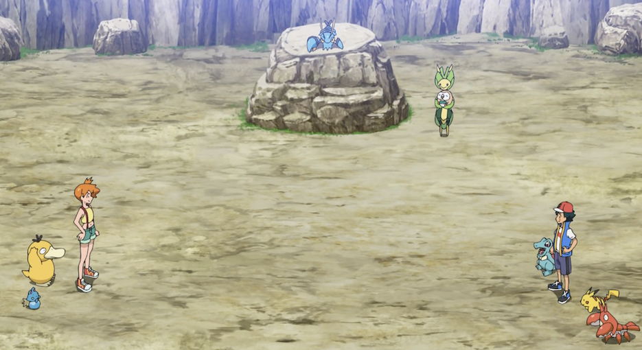 So können sich Ash und Misty nun ihrem Kampf widmen. Beide vereinbaren einen 1-gegen-1-Kampf; der Gewinnende darf schließlich Scampisto fangen. Dieses sitzt auf einem Felsen zwischen den beiden und beobachtet alles aufmerksam.