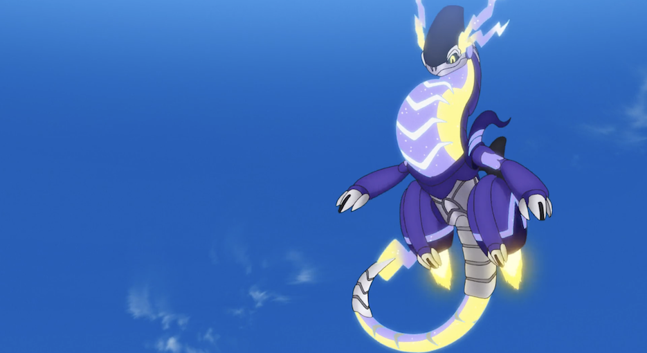 Hinweis: Am Ende der Episode ist erneut eine kleine Mini-Episode zu sehen. Team Rocket hat den Auftrag bekommen, neue Pokémon in der Paldea-Region zu fangen. Bei ihrer Expedition in einem Küstengebiet bemerken sie diesmal Miraidon, das über einem Felsen schwebt. Als sie das Legendäre Pokémon fangen wollen, bemerkt dieses die drei, fliegt einmal schnell über die hinweg, um sie dann mit einer starken Elektro-Attacke in die Flucht zu schlagen.