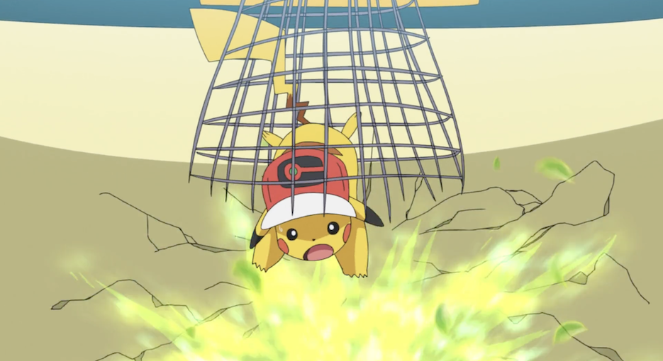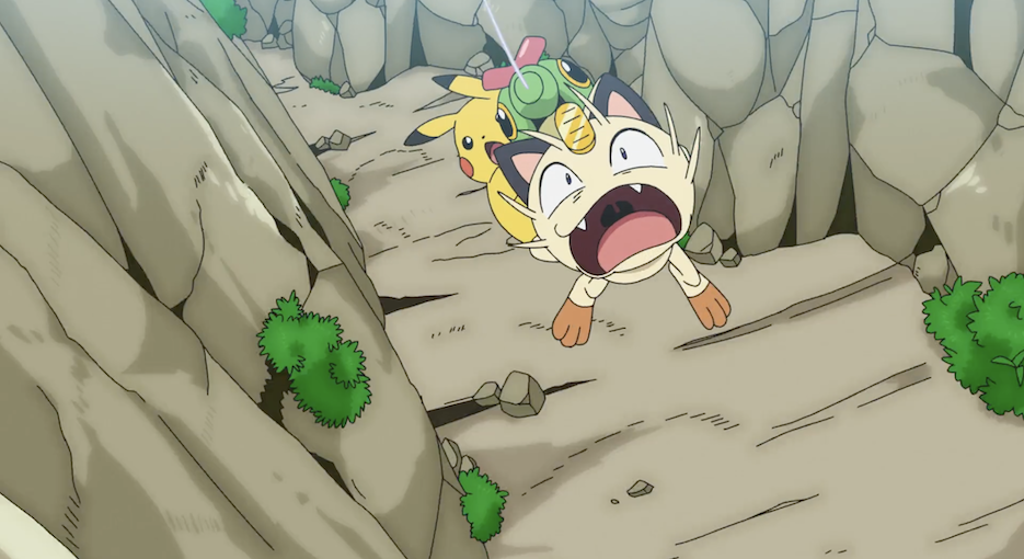 Pikachu möchte unbedingt Ashs Kappe wiederfinden. Davon lässt es sich auch nicht von Mauzi aufhalten, das ihm daraufhin dennoch folgt, um die Gelegenheit nicht zu verpassen, es sich später zu schnappen. Mit Mühe können sie eine Wand hochklettern, über die sie schließlich das kleine Ausgangsloch erreichen, aus dem bereits Ashs Kappe geweht worden ist, und das sie aus der Höhle führt. Von dort aus entdeckt Pikachu das Raupy und erkundigt sich bei diesem nach der Kappe. Das Käfer-Pokémon berichtet ihnen, dass es diese gesehen habe und bietet ihnen an, ihm zu folgen und sie zu dieser zu führen. Raupys langsames Tempo verlangt den beiden allerdings viel Geduld ab.