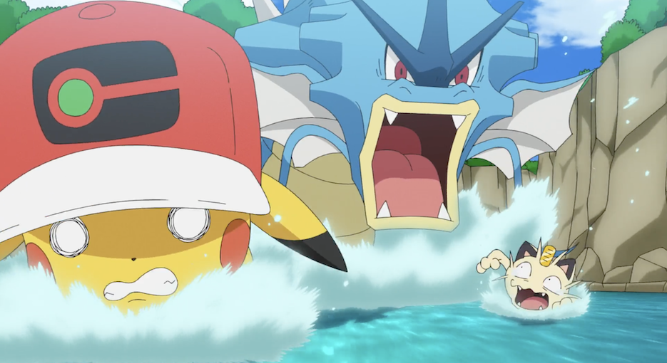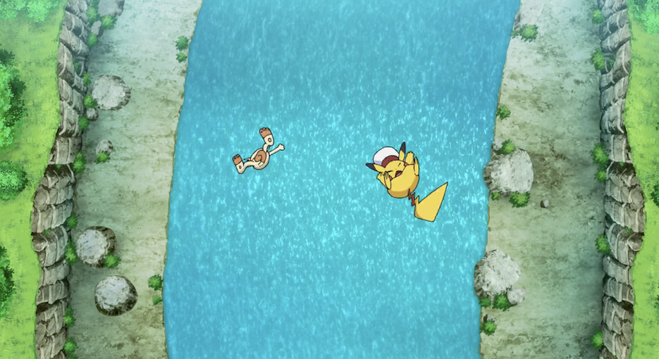Pikachu bemerkt, dass es Ashs Kappe verloren hat. Es entdeckt diese hinter einem aus dem Wasser herausragenden Stein und ist froh, diese wieder auf seinem Kopf zu wissen. Die Erleichterung ist jedoch nur von kurzer Dauer, als es bemerkt, wie Mauzi, verfolgt von einem Garados, ihm entgegen schwimmt. Die beiden schwimmen flussaufwärts vor dem Garados weg, direkt auf einen Wasserfall zu, von dem sie sich jedoch nicht aufhalten lassen. Als sie diesen erklommen haben, atmen sie kurz erleichtert auf. Pikachu ist allerdings sofort wieder in Lauerstellung, als es richtig realisiert, dass Mauzi bei ihm ist. Dieses bietet Pikachu solange einen Waffenstillstand an, bis die beiden wieder jeweils ihre Freunde gefunden haben. Insgeheim plant Mauzi jedoch, Pikachu dafür zu benutzen, um Jessie und James wieder zu finden und es sich schließlich gemeinsam mit den beiden zu schnappen.