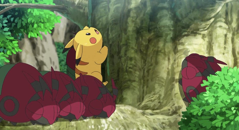 Pikachu läuft Raupy geduldig hinterher, doch Mauzi ist dessen Tempo nicht schnell genug. Deshalb nimmt Mauzi es auf seinen Rücken. Schnell wird es diesem aber zu schwer. Als dann auch noch Pikachu auf Mauzis Rücken springt, beginnt es zu protestieren, doch so kann Raupy die drei mit seiner Fadenschuss-Attacke schnell von Baum zu Baum schwingen, wodurch sie schließlich vor einem großen Baum landen, in dessen Krone sich Ashs Kappe befindet. Pikachu freut sich darüber und versucht direkt, auf den Baum zu klettern, während Mauzi und Raupy vom Boden aus mitfiebern. Schnell stellt es allerdings fest, dass sich auf diesem einige schlafende Toxiped befinden. Entschlossen klettert es jedoch weiter und versucht, unbemerkt zu bleiben. So kann es schließlich die Mütze bergen. Als es sich mit dieser jedoch wieder langsam nach unten begibt, fällt ein Blatt von dem Baum, das direkt auf Mauzis Nase landet, wodurch dieses laut Niesen muss und so die Toxiped aufweckt. Pikachu rennt schnell vom Baum und begibt sich mit Raupy auf Mauzis Rücken, sodass Raupy sie wieder mit Fadenschuss davontragen kann. Allerdings wird Mauzi noch von einigen Giftstacheln der Toxiped erwischt.