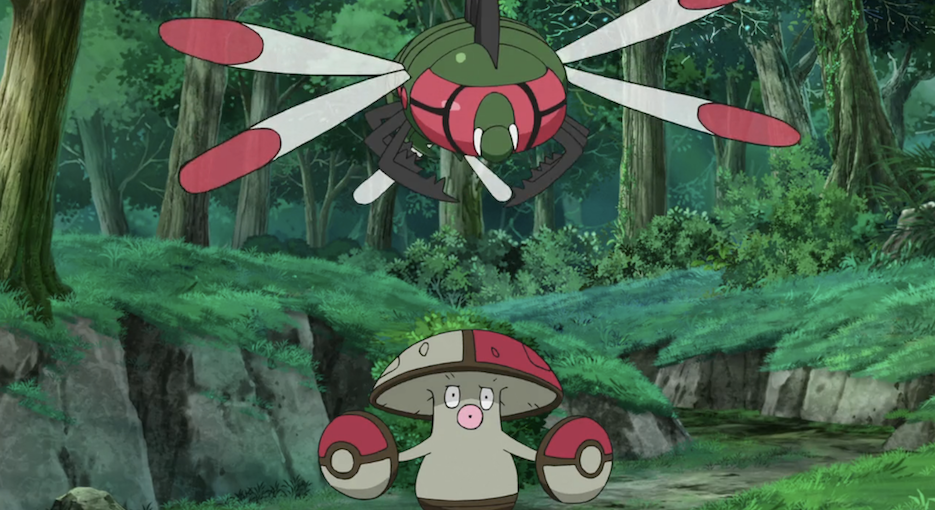 Auf dem Weg durch den Wald tauchen, ganz nach dem Plan von Team Rocket und mit dem Ziel, die Gruppe zu trennen, Yanmega und Hutsassa auf und greifen an. Rocko setzt Kappalores ein, welches Hutsassas Pilzsporen mit Aquaknarre unschädlich machen kann. Misty und Rocko fragen sich, warum die beiden Pokémon sie attackieren. Sie vermuten, dass sie entweder in deren Revier eingedrungen seien oder es sich um Team Rockets Pokémon handelt, die sie und Pantimimi verfolgen. Rocko schlägt vor, zurückzubleiben, um sich mit Kappalores und Glibunkel um sie zu kümmern.