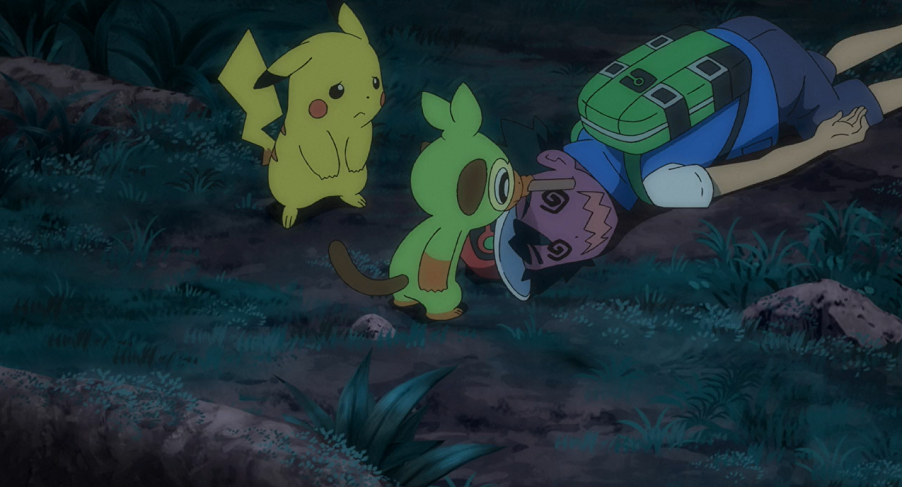 Als aus diesem Wagen hinter ihnen plötzlich ein Knall ertönt und die Scheiben zu Bruch gehen, schrecken Ash, Goh und der Junge auf. Sie blicken aus dem kaputten Fenster ihres Wagens nach hinten und können, da der Zug in dem Moment eine Kurve fährt, sehen, wie durch eine weitere Explosion das Dach eines hinteren Wagens aufbricht und aus diesem Kryppuk hervorschaut. Der Junge murmelt vor sich hin, dass Kryppuk aufgewacht sei. Er meint außerdem zu verstehen, dass das Pokémon einen seiner Geister zurück möchte. Mit Blick auf Ash erkennt er, dass dieser Geist, der zuvor Teil des Kryppuk gewesen sei, nun in Ash lebe. Goh wird nun klar, weshalb sich Ash so merkwürdig und unverschämt verhält. Pikachu versetzt ihm nochmals einen Donnerblitz, doch Ash lässt sich nicht aufhalten. Goh weist den Jungen an, zu versuchen, den Geist aus Ash herauszubekommen, während er selbst sich um Kryppuk kümmere und versuche es aufzuhalten. Im selben Moment beginnt der Zug erneut leicht zu ruckeln, wodurch der Teil eines Astes von einem der Bäume abbricht, Ash direkt auf den Kopf fällt und diesen so ausknockt.