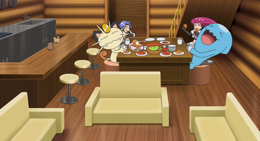 Als sie wieder aufwachen, befinden sie sich im Warmen vor einem Kaminfeuer im Inneren des Restaurants. Schnell entdecken sie einen reichlich mit Essen gedeckten Tisch und stürzen sich darauf. Kurz darauf taucht auch eine Frau mit ihrem Rattikarl auf, die weiteres Essen bringt und sie anhält, ruhig zu essen, da genügend da sei. Team Rocket ist der Frau sehr dankbar, dass diese sie gerettet habe. Es braucht kurze Zeit, bis ihnen klar wird, dass es sich bei der Frau um Cassidy handelt, die gemeinsam mit ihrem Partner Butch ebenfalls ein Team Rocket-Duo gebildet hat und stets mit Jessie und James in Konkurrenz gestanden ist. James vermutet, sie sei in einer Mission hier, doch Cassidy räumt diese Vermutung gleich vom Tisch und erklärt, dass sie bei Team Rocket aufgehört habe. Sie habe, trotz dessen, dass sie eine höhere Position innerhalb der Organisation als Jessie und James gehabt habe, das Leben aus ständigen Missionen, Belehrungen und Entschuldigungen irgendwann satt gehabt. Daher habe sie ein Restaurant eröffnet und widme sich dort auch ihrem neuen Hobby, der Holzschnitzerei. Sie lädt Jessie und James dazu ein, zu bleiben, bis sie wieder vollständig bei Kräften seien.