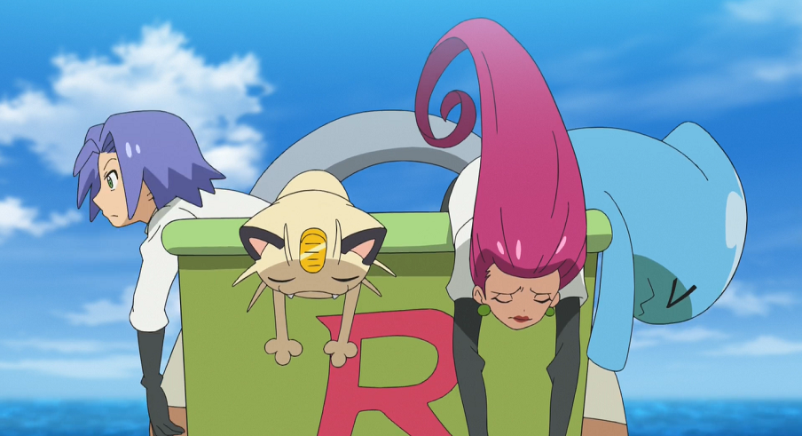 Als sie sich zu einer kleinen Pause mit ihrem Proviant nach draußen begeben, ist Team Rocket nach der vielen erfolgreich erledigten Arbeit sehr zufrieden. Auf einmal sehen sie Pelipper, das an ihnen vorbeifliegt und ihnen kommt wieder in den Sinn, weshalb sie eigentlich hier sind. Jessie möchte sofort die Verfolgung aufnehmen und meint, sie hätten sich genug bei Cassidy für ihre Hilfe revanchiert. James hingegen möchte nicht Hals über Kopf und ohne sich zu verabschieden einfach so gehen. Jessie bietet James an, hier zu bleiben, da er sehr glücklich wirke. Mauzi berichtet, dass es James noch nie so glücklich gesehen habe, als dieser gemeinsam mit Cassidy und Rattikarl einen seiner Lieblingskronkorken in Holz nachgeschnitzt habe. Alle legen daraufhin nochmals ihre Hände zusammen, ehe Jessie, Mauzi und Woingenau traurig davonlaufen, um Pelipper zu folgen, und James zurücklassen.