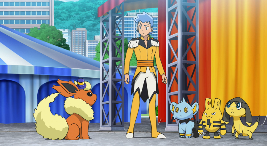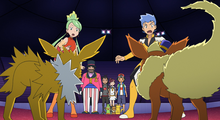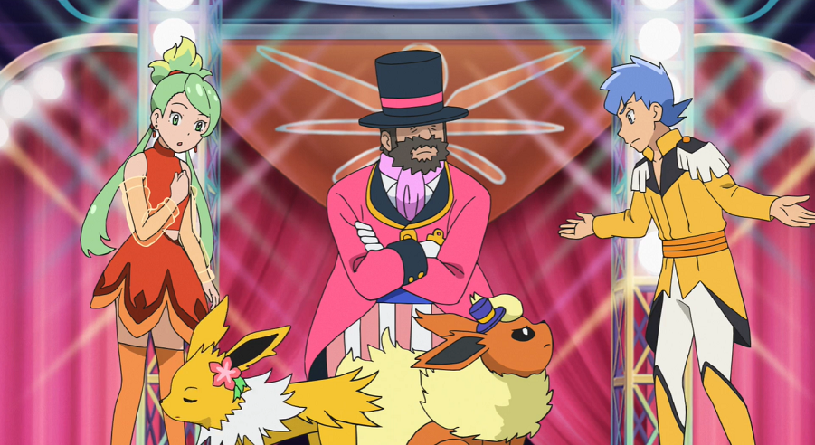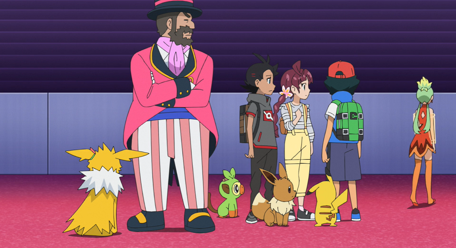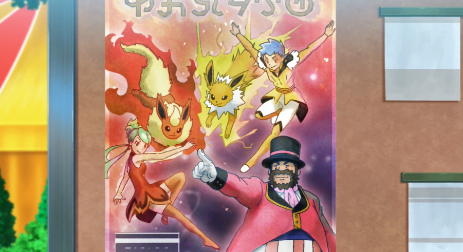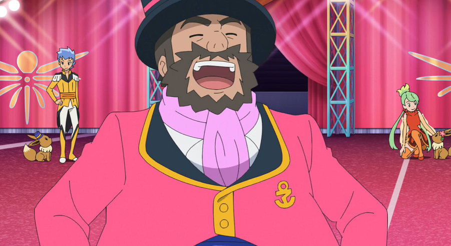 Der Zirkusdirektor kommt und begrüßt die drei. Ash und Goh sind kurz verdutzt, da dieser sie sehr stark an den Museumsdirektor aus Marmoria City sowie den Expeditionsleiter erinnert, denen sie bei ihren Abenteuern schon häufiger begegnet sind. Der Direktor ist erfreut, als Ash und Goh ihm berichten, dass die Proben ihnen sehr gefallen haben.