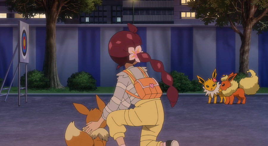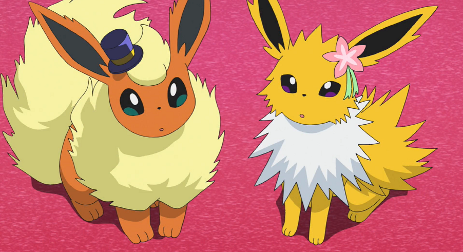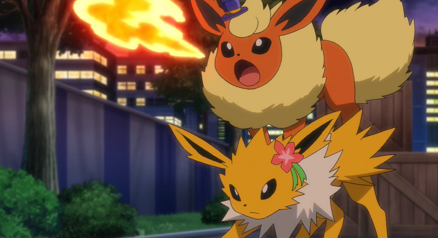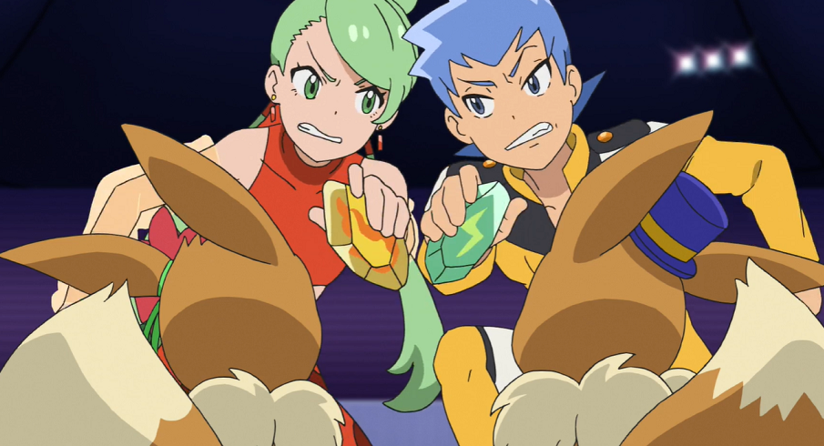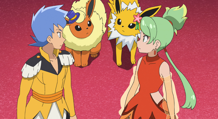 Ash, Goh und Chloe tauchen auf und stellen fest, dass Harmony und Billy wieder mit ihren tatsächlichen Partner-Pokémon trainieren. Allerdings klappt auch dies weniger gut als geplant, da beide nicht auf die Elektro- bzw. Feuer-Attacken ihres Pokémon eingestellt sind. Der Direktor denkt daher darüber nach, diesen Teil aus der Show zu streichen. Auch Harmony und Billy erklären, damit einverstanden zu sein, bevor sie selbst nur einen halbgaren Auftritt hinlegen. Beide erklären ihren Pokémon gegenüber, dass nichts davon deren Schuld sei. Nacheinander verabschieden sie sich in eine Pause, während Blitza und Flamara geknickt zurückbleiben. Entschlossen blicken sich die beiden Pokémon an und verschwinden nach draußen. Chloe und Evoli folgen ihnen und können beobachten, wie sie gemeinsam im Hinterhof trainieren. Auch Ash und Goh stoßen hinzu. Goh vermutet, dass die beiden zusammenarbeiten, damit der Auftritt zustandekommen kommen kann. Motiviert springt Evoli Blitza und Flamara zur Seite und kopiert deren Elektro- und Feuer-Attacke. Chloe nimmt an, dass Evoli mit den beiden auftreten möchte, was Ash für eine ausgezeichnete Idee hält.