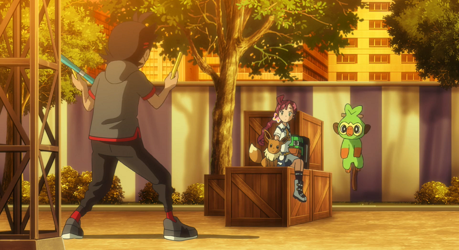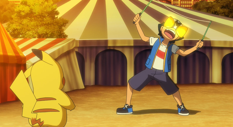 Es dämmert bereits, als Ash und Pikachu sowie Goh und Chimpep fleißig im Hinterhof des Zirkuszeltes üben. Chloe ist mit Evoli in Gedanken versunken. Während Ash und Pikachu mit dem Diabolo und der Donnerblitz-Attacke trainieren, versuchen sich Goh und Chimpep an einer Darbietung mit Stäben und Chimpeps Zweigstoß-Attacke. Bei beiden klappt es allerdings noch nicht so, wie geplant.