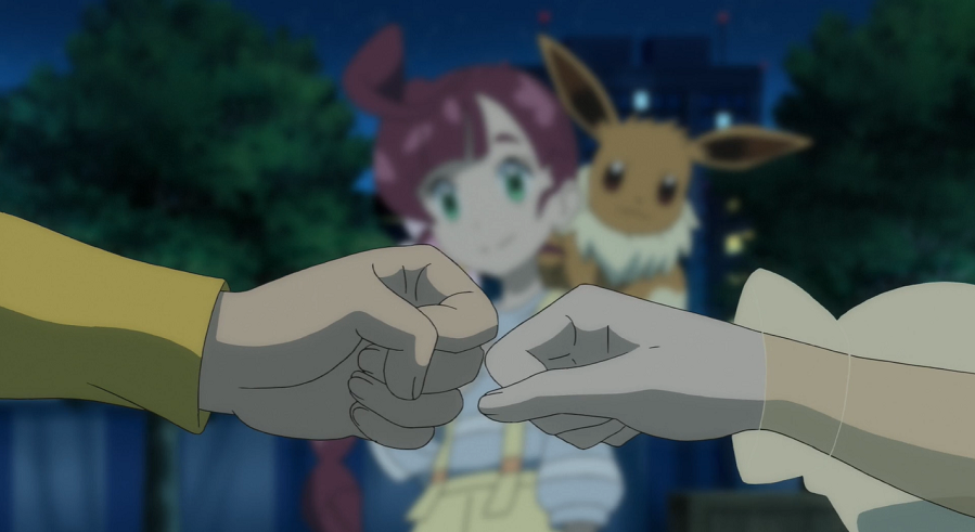 Harmony und Billy bedanken sich bei Ash, Goh und Chloe für deren Unterstützung, die Show sei ein voller Erfolg gewesen. Alle sind daher sehr glücklich. Als Zeichen des Dankes überreichen Harmony und Billy Chloe einen Feuer- sowie einen Donnerstein, den sie einsetzen könne, sobald sich ihr Evoli bereit fühle, sich zu entwickeln. Chloe bedankt sich dafür und verspricht ihrem Evoli, dass sie, wozu es sich auch entwickeln sollte, zusammen bleiben.