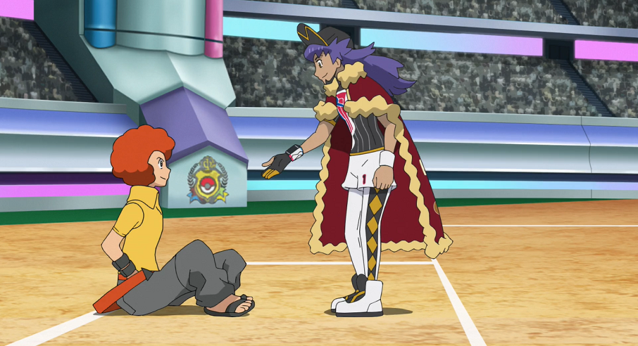 In der Lobby des Stadions angekommen möchte Ash so schnell wie möglich auf die Tribüne. Im Augenwinkel bemerkt er ein Fernsehgerät, auf dem der Kampf übertragen wird. Dort ist zu sehen, wie Ignaz, das Top-Vier-Mitglied aus der Sinnoh-Region, und dem Kommentator zufolge auf Platz 7 der Rangliste platziert, mit seinem Panferno gegen Delion und dessen Glurak kämpft.