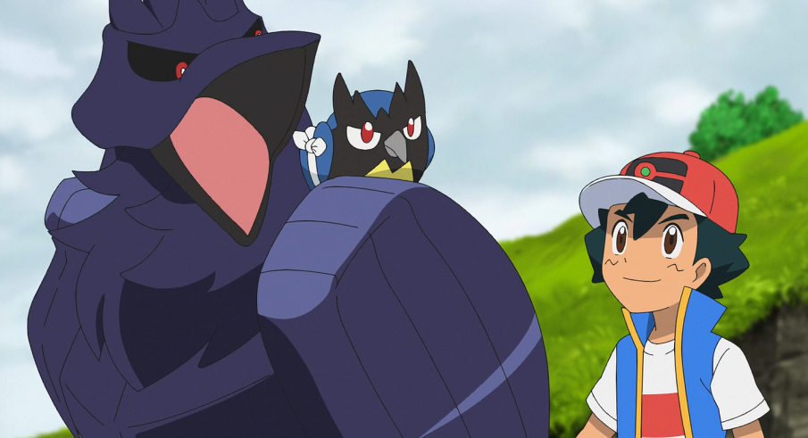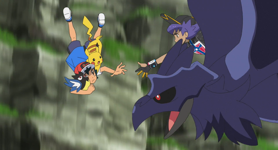 Oben angelangt entdeckt Ash ein Nest mit drei Meikro, von denen eines am Flügel verletzt ist. Ash versteht nun, weshalb die Krarmor sich so verhalten haben und will Delion informieren. Im selben Moment kommt allerdings eines der Grolldra angeflogen und nähert sich dem Nest. Das zweite, immer noch wütende Krarmor in der Luft bemerkt dies sofort aus dem Augenwinkel und fliegt zum Nest, wo es das Grolldra attackiert, um die Meikro zu schützen. Durch den dadurch erzeugten Wirbelwind werden jedoch auch die Meikro aus ihrem Nest geweht. Während sich die zwei gesunden Meikro retten können, kann Ash das verletzte, flugunfähige Meikro nur durch einen Sprung von der Klippe auffangen. Delion kann Ash schließlich auf Krarmor vor dem Sturz bewahren.