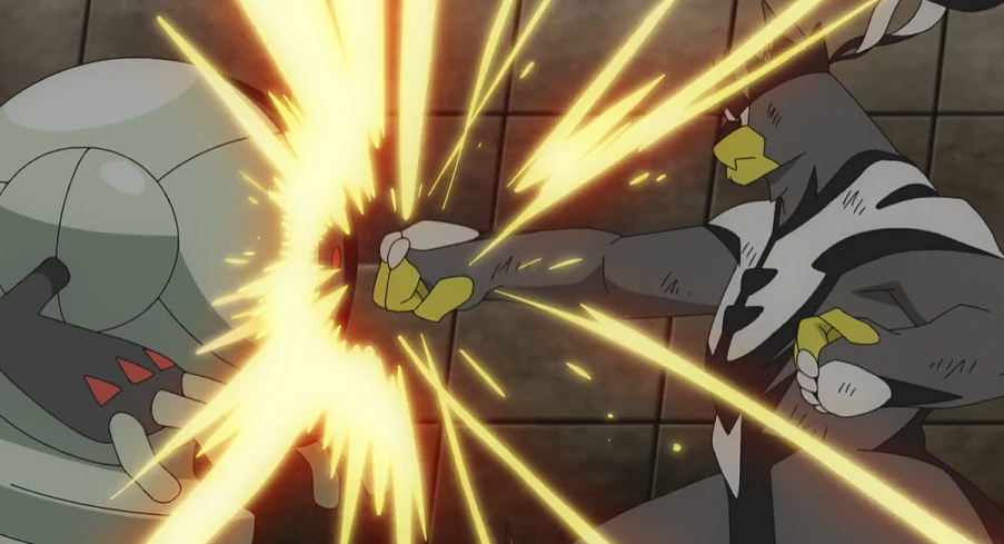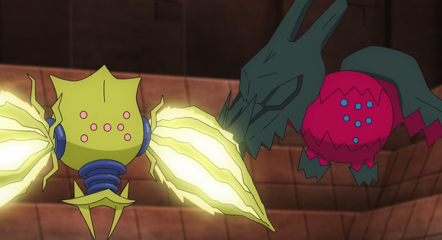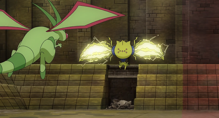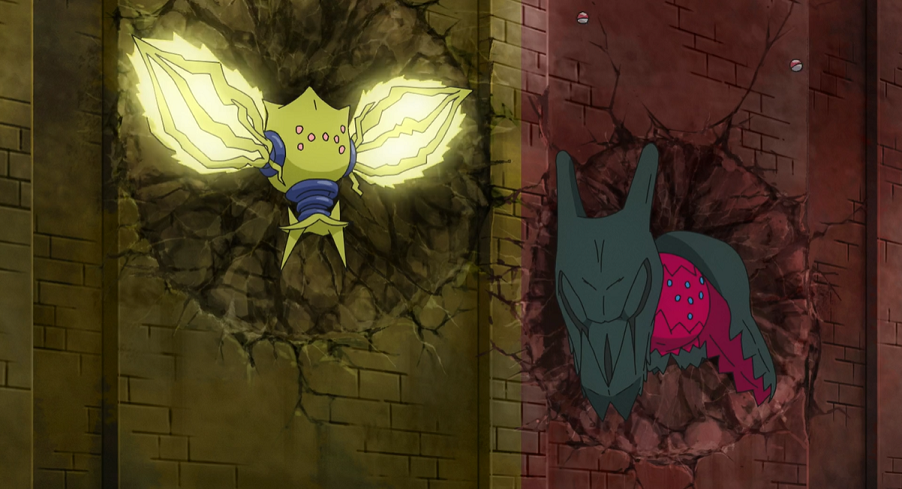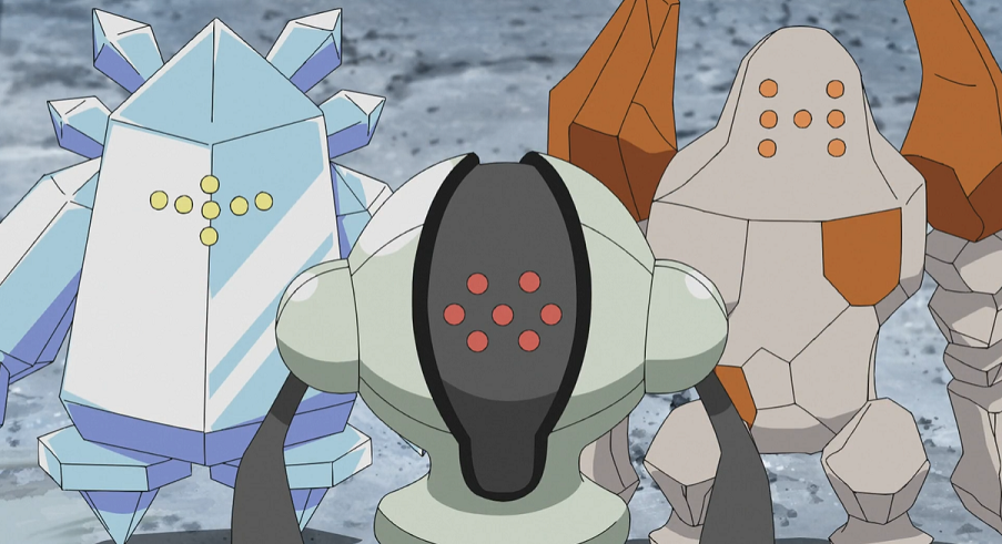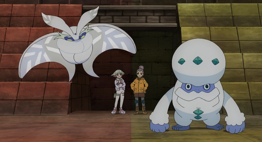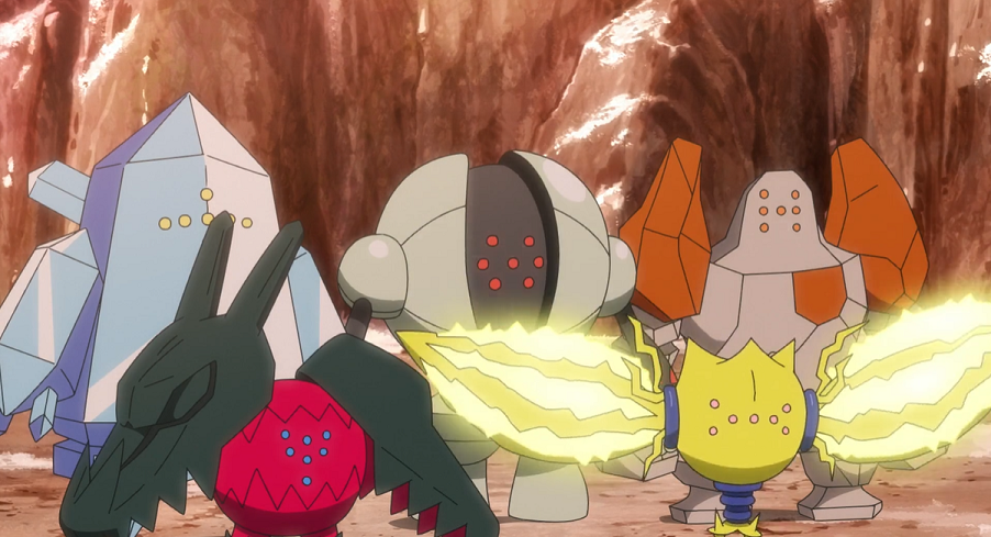 Goh und Gary unternehmen, beobachtet von Layla und Steffen, einen neuen Anlauf und können schließlich die Muster richtig nachspringen. Dadurch beginnen beide Statuen zu leuchten und Regieleki sowie Regidrago erscheinen aus der Wand dahinter. Goh möchte sich um Regieleki kümmern und setzt Libelldra ein, während Gary Silembrim gegen Regidrago in den Kampf schickt. Anders als jedoch geplant, beginnen Regieleki und Regidrago im Team zu arbeiten: Regieleki nimmt Silembrim mit Blitzgefängnis gefangen. Das kurz abgelenkte Libelldra wird derweil von Regidrago getroffen. Anschließend kümmert sich wieder Regieleki erfolgreich um Libelldra, während Regidrago Silembrim besiegt.