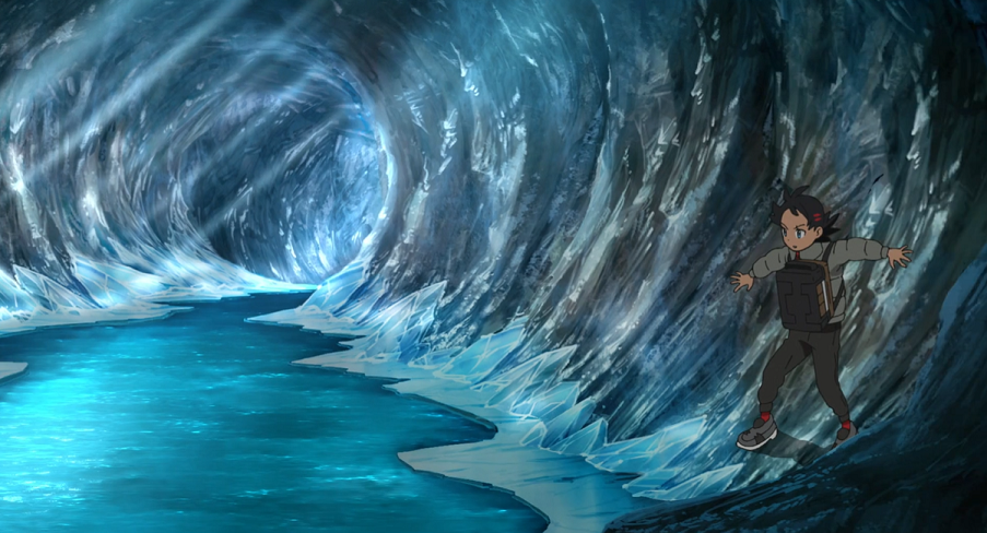 Schließlich endet ihr Gespräch abrupt, als sie einen großen Raum mit zwei Statuen erreichen. Der Raum ist, wie bereits der Eingang und der Weg dorthin, jeweils hälftig gelb und rot, in jeder Hälfte steht eine der Statuen. Vor diesen befinden sich auf dem Boden Punkte, die Goh und Gary ins Auge fallen. Goh erinnert sich an die Muster beim Eingang und vermutet, dass diese ein Hinweis sein könnten. Als Gary auf der roten Seite einen der Punkte betritt, beginnt dieser zu leuchten und bleibt auch leuchtend, als er zum nächsten passenden Punkt springt. Auf der gelben Seite versucht es Goh ebenfalls und löscht damit wieder die leuchtenden Punkte auf Garys Seite. Dieser vermutet, dass nur die Punkte auf einer der beiden Seiten zu einem Zeitpunkt aufleuchten können und man daher auch nur eines der beiden Pokémon herausfordern könne. Goh versucht als Erster, das gelbe Muster vom Eingang nachzuspringen. Gary jedoch hört auch nicht auf, weshalb beide nicht weiterkommen. Daher kommt die Idee auf, über einen Kampf zu klären, wer den Vorzug erhält. Doch zuvor hat Gary noch eine andere Idee: Er fragt sich, ob es eine Möglichkeit gebe, beide Legendären Pokémon zu fangen. Goh greift den Gedanken auf und schlägt vor, dass beide zusammenarbeiten, um synchron jeweils von Punkt zu Punkt und damit auf beiden Seiten die Muster nachzuspringen. Als sie dies versuchen, klappt es tatsächlich wie erhofft. So ist auf beiden Seiten jeweils nur noch ein Punkt übrig, den sie zum Leuchten bringen müssen. Plötzlich hören sie jedoch Rufe und werden unmittelbar danach durch Eis-Attacken angegriffen und auf ihren aktuellen Standpunkten durch große, sie umgebende Eiszapfen festgehalten. Goh erkennt Layla und Steffen wieder, die sich ebenfalls für das Projekt Mew bewerben, und die ihn und Gary mit ihren Pokémon Mottineva und Galar-Flampivian nun am Fortschreiten hindern. Beide hat er bei den letzten Probemission kennengelernt. Gary ahnt sofort, dass sie ihnen ihre Idee klauen und Regieleki und Regidrago fangen wollen. Jedoch haben er und Goh sich auf eine solche Situation vorbereitet. Mit Hilfe ihrer Pokémon Silembrim und Liberlo können sie sich befreien. Gemeinsam wollen Goh und Gary die beiden in einem Kampf besiegen. Gary schlägt vor, dass jeder nur ein Pokémon einsetzen dürfe, um auch noch schlagkräftig genug für den Kampf mit Regieleki und Regidrago zu bleiben. Layla und Steffen stimmen dem zu.