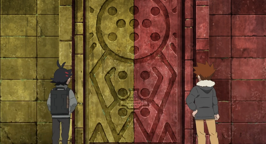 Auf Kronen-Schneelande angekommen, beginnt Goh sich durch die eisige Landschaft zu kämpfen, ehe er schließlich die Zwiespaltruinen erreicht. Vor diesen trifft er auf Gary, der scheinbar schon auf ihn gewartet und in der Zwischenzeit bereits den Eingang zu den Ruinen untersucht hat. Den beiden fällt auf, dass die Ruinen jeweils hälftig eine gelbe und rote Farbe haben und dass zwei Muster den Eingangsbereich zieren. Auf der Tür, die Goh vergeblich versucht selbst zu öffnen, steht ein Spruch, den sie nicht entziffern können. Im selben Moment taucht Quentin auf, der ihnen den übersetzten Spruch sagt. Gary und Goh schließen aus diesen, dass sie den Eingang nur mit Regirock, Regice und Registeel öffnen können. Dies ist das Zeichen für Quentin, der drei Hyperbälle zückt, aus denen zum Erstaunen von Goh und Gary diese drei Legendären Pokémon auftauchen. Durch sie öffnet sich tatsächlich der Eingang zu den Ruinen. Quentin weist die beiden an, reinzugehen, wobei sie jedoch jeweils maximal nur zwei Pokémon einsetzen dürften.